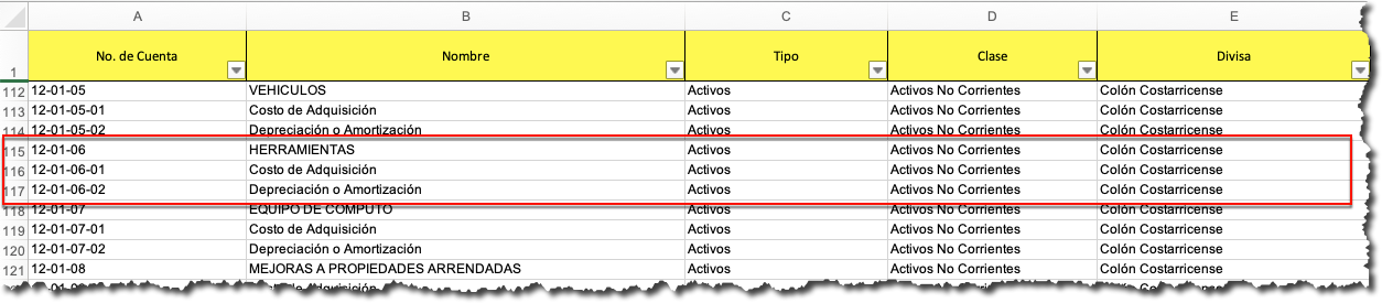 Para este ejemplo, no debes borrar sólo la cuenta 12-01-06 HERRAMIENTAS, sino que debes borrar las dos subcuentas 12-01-06-01 Costo de adquisición y 12-01-06-02 Depreciación o Amortización. De este modo las subcuentas no quedarán ‘huérfanas’ dentro del catálogo de cuentas lo cual causaría que se corrompa la estructura del catálogo de cuentas.