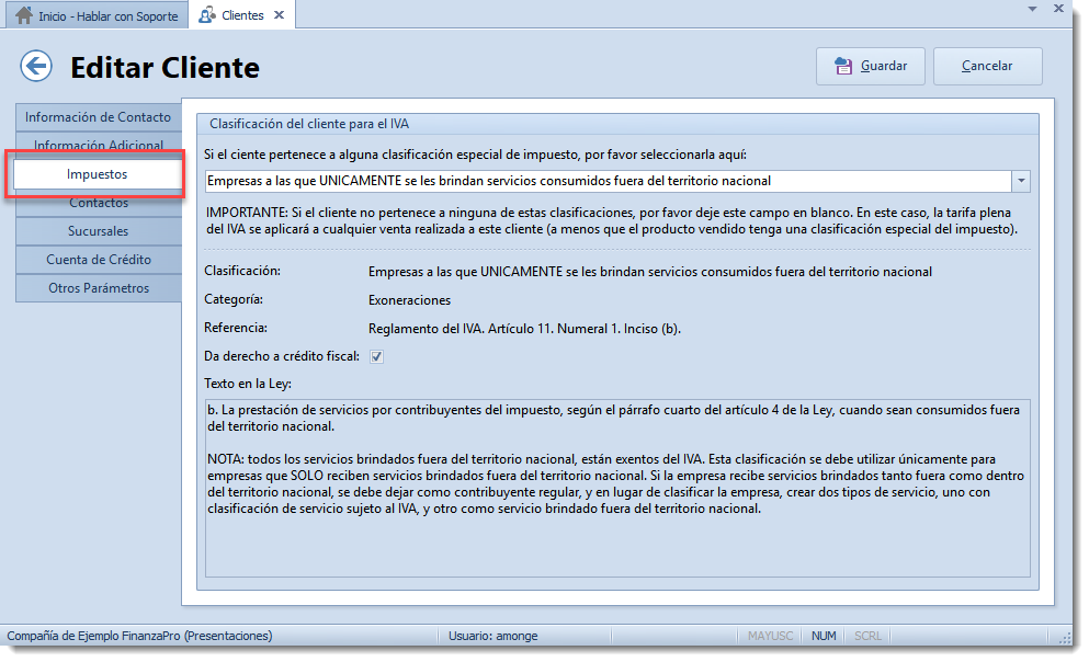 En FinanzaPro, se le está dando el mismo tratamiento a todas las ventas: toda venta o servicio está gravado con la tarifa plena del 13%, EXCEPTO si el cliente o el producto pertenecen a alguna de las clasificaciones especiales indicadas por la ley.